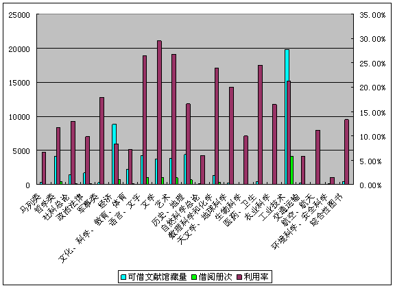 由学科分类利用数据得知,文献利用率最高的学科是文学类,达29.43%;其次是艺术类和语言文字类,利用率分别为26.72%和26.462%;医药卫生类文献利用率为24.51%,利用率相对较少的为环境科学和安全科学类。